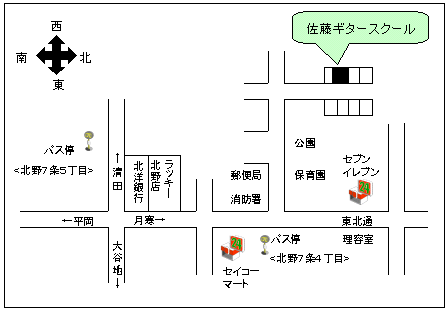 | バス利用の場合 ※以下のバスは、いづれも北野7条4丁目下車徒歩3分 |
